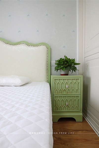 臥室作為休息區(qū)域,在布置上主要以溫馨、舒適為主,沒有繁瑣復(fù)雜的裝飾,搭配簡(jiǎn)潔的柜門、床品,營(yíng)造出靜謐和諧的氛圍,青綠色櫥柜又讓臥室看上去更加靈動(dòng)清新。