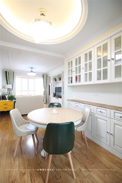 餐廳與客廳的空間應(yīng)用全通透,既滿足了使用功能又增添了空間視線互通。在燈具的選擇上也注重冷暖搭配,色彩呼應(yīng),經(jīng)典的家具搭配獨(dú)特的配飾 宛如藝術(shù)心靈的沖撞。業(yè)主非常享受在餐桌上辦公,用他的話說“陽光很暖、氛圍很好”。