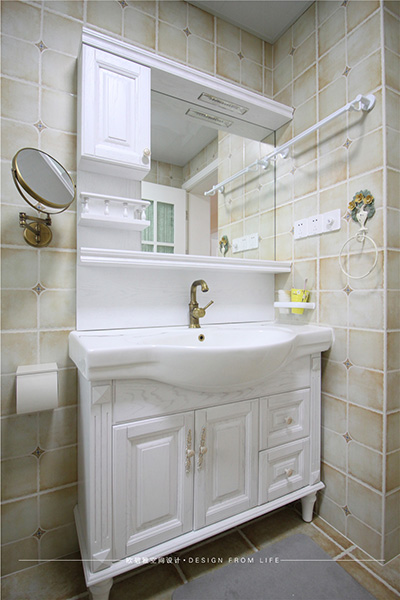 衛(wèi)生間的設(shè)計(jì)、干濕分離、因?yàn)槭亲背系姆孔樱晒馀c通風(fēng)兼具,洗浴門用玻璃隔斷,簡(jiǎn)約通透、現(xiàn)代感十足,洗手臺(tái)銅鏡的搭配,別致新穎,打造溫馨浪漫的小資情調(diào)。