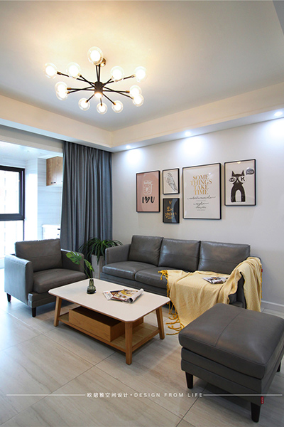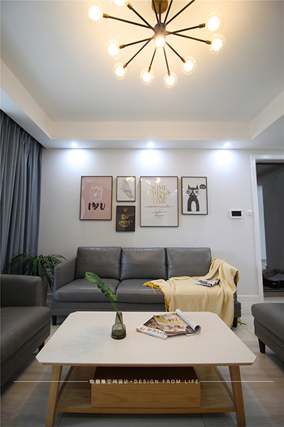 客廳整體以淺灰色系為基調(diào),使空間的搭配柔和而恬靜,適合于浪漫溫馨的新婚小夫妻,也與他們簡單的生活方式所匹配。小清新文藝掛畫和簡約創(chuàng)意吊燈,散發(fā)著濃濃的北歐格調(diào)。