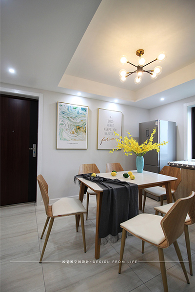 餐廳的一抹金色,傳遞出家的暖意,沒有過多復(fù)雜的裝飾,給人清爽干凈的感覺,搭配開放式的餐桌與客廳相連一體,既把長形空間運(yùn)用得當(dāng),又使整個空間看上去更空曠和諧。