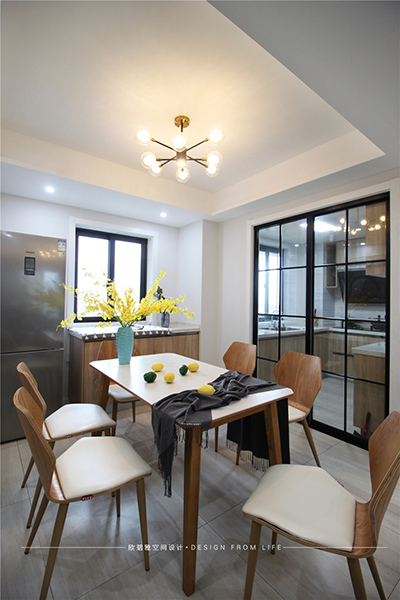 改造四-五:原始廚房和餐廳都是單獨(dú)的個體,使用起來比較麻煩也浪費(fèi)時間。設(shè)計(jì)師改善之后的戶型將廚房與餐廳互通,用網(wǎng)紅推拉門作為分割,既擺脫了油煙散發(fā)的問題又使整個空間的視覺瞬間提升,使用也更加便捷。