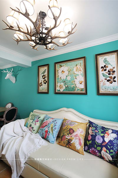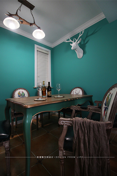 本案的設(shè)計(jì)營造浪漫、自由、高雅的古典風(fēng)格,給人帶來自然舒適、悠然輕松的生活情趣。墻壁上的鹿角和吊燈搭配著古典的美式家具,豐富了空間的視覺效果,呈現(xiàn)出了美式的自由豪爽。